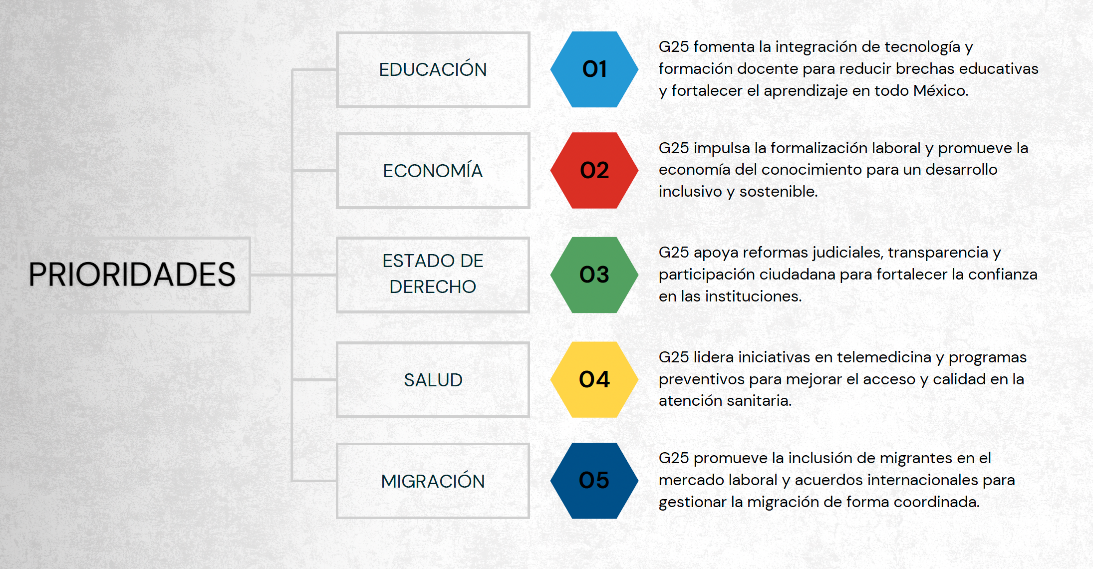 El G25 es un movimiento comprometido con la transformación de México, centrado en la intersección de la educación, la salud, la migración, la economía y el estado de derecho. No somos una organización política ni partidista, sino una comunidad de líderes que buscan generar soluciones concretas y sostenibles para el país.